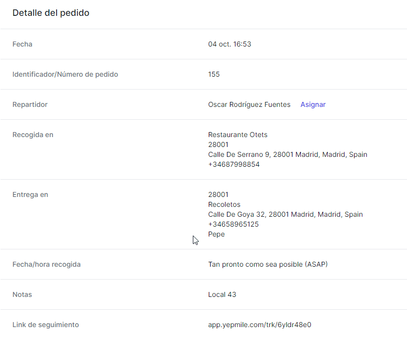 Aquí podrás visualizar los datos principales del pedido, si tiene repartidor o no asignado y en qué estado está.