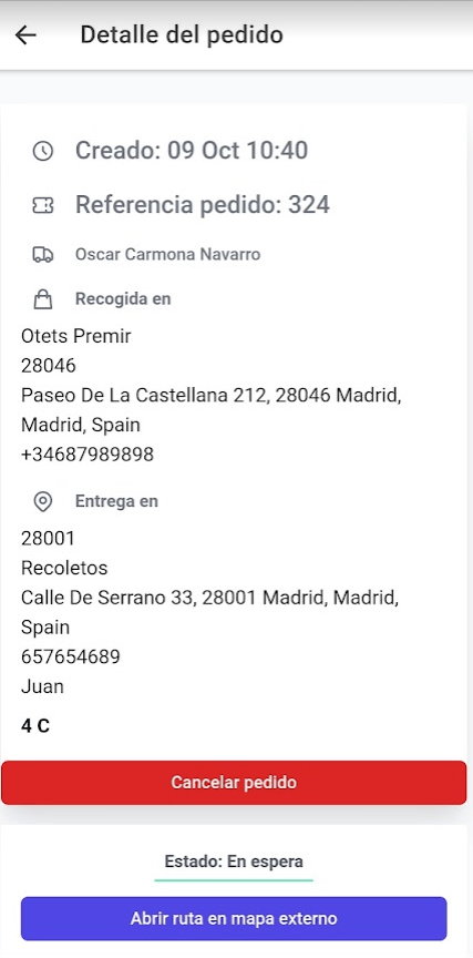 Si se ha producido algún error en la petición de reparto puedes cancelarlo, mientras el pedido se encuentre En espera en la pantalla de detalle del pedido con el botón